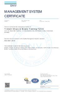 Trident Ships & Boats Trading FZCO, Dubai, UAE, is proud to be ISO 9001:2015 certified for our quality management system. This certification covers the supply, design, and building of aluminum ships, boats, hovercrafts, fire rescue boats, and landing crafts, along with repairs and services.